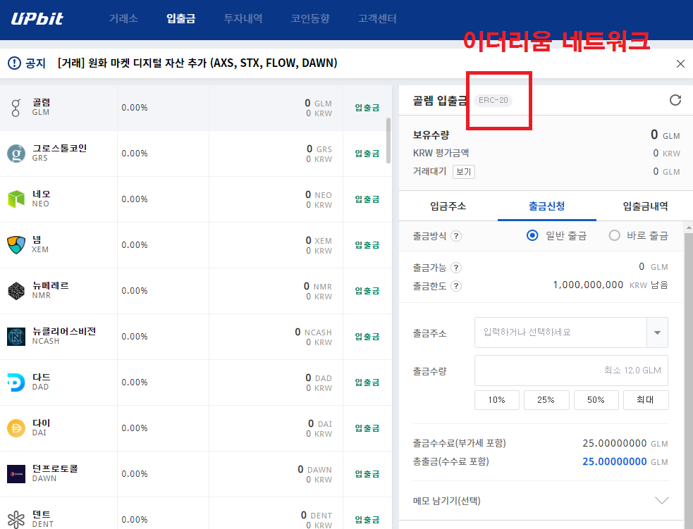 예를 들어 골렘(GLM)코인을 출금합니다.