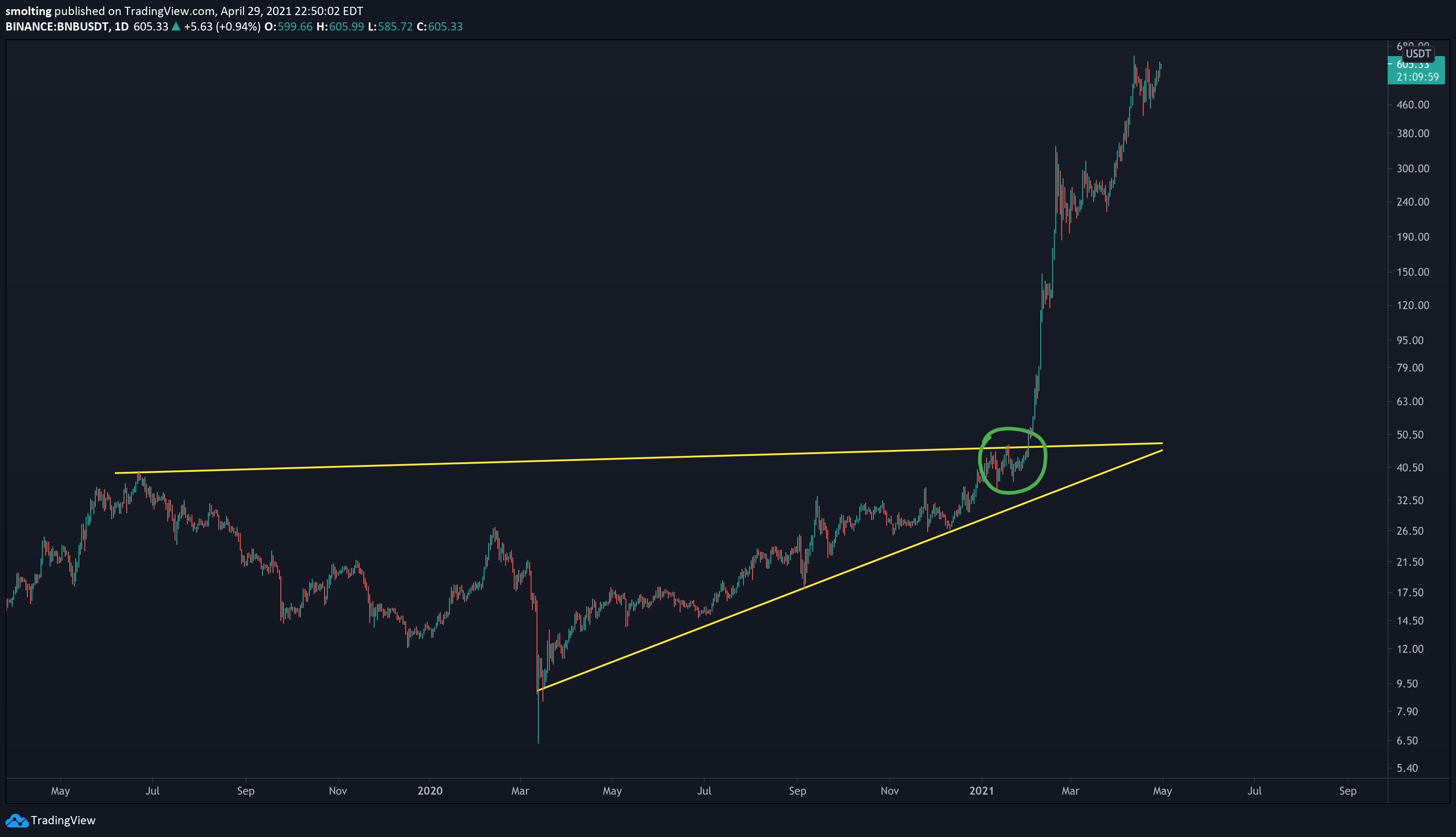 왼쪽 차트는 BNB 코인이 전고점을 돌파 후