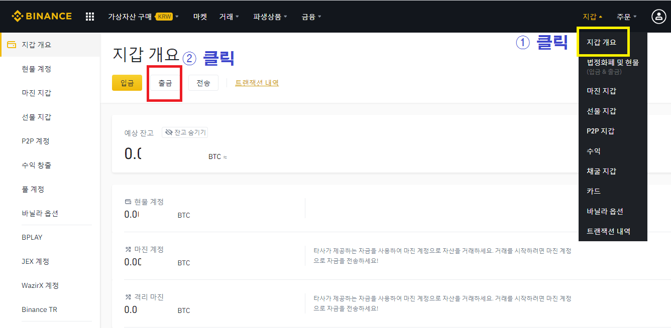 로그인 후 상단에 지갑 -> 지갑 개요 클릭