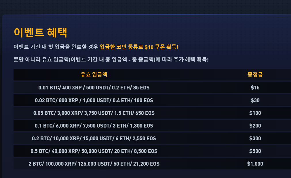 이벤트 기간 내 아래 자산 첫 입금할 경우