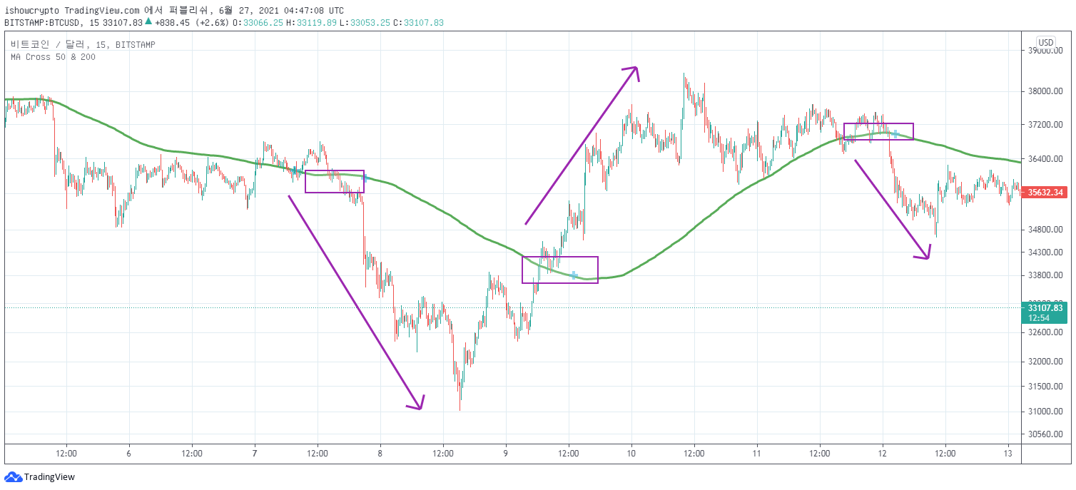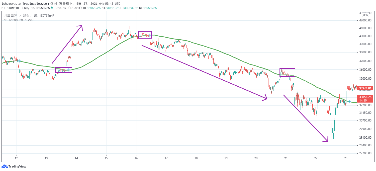 200 이동평균선의 위쪽 또는 아래쪽으로
