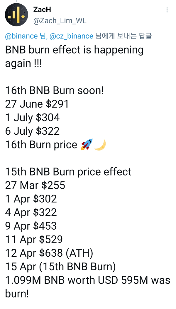 BNB코인 소각 발표 시 가격에 긍정적인