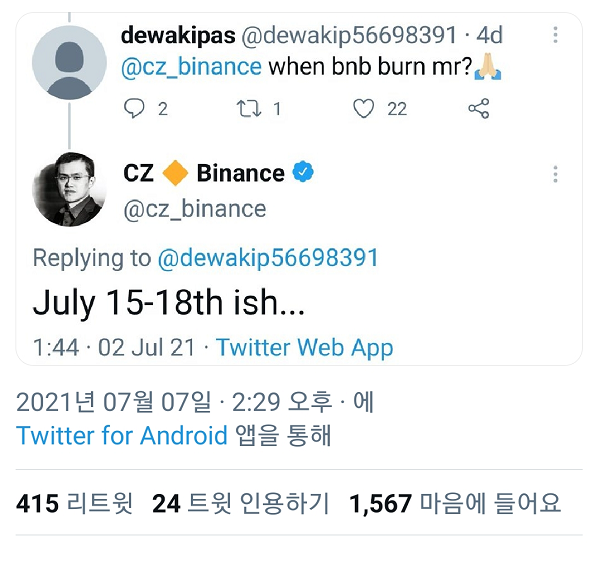 "언제 BNB코인을 소각하냐"고 묻자