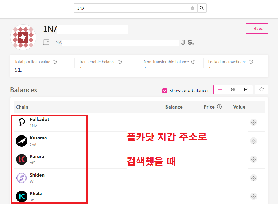 돌아와서 위 주소 검색창에 쿠사마 주소 또는 폴카닷 주소 중 어느 것을 넣어도 같은 조회 결과가 나오는 것을 알 수 있습니다.
