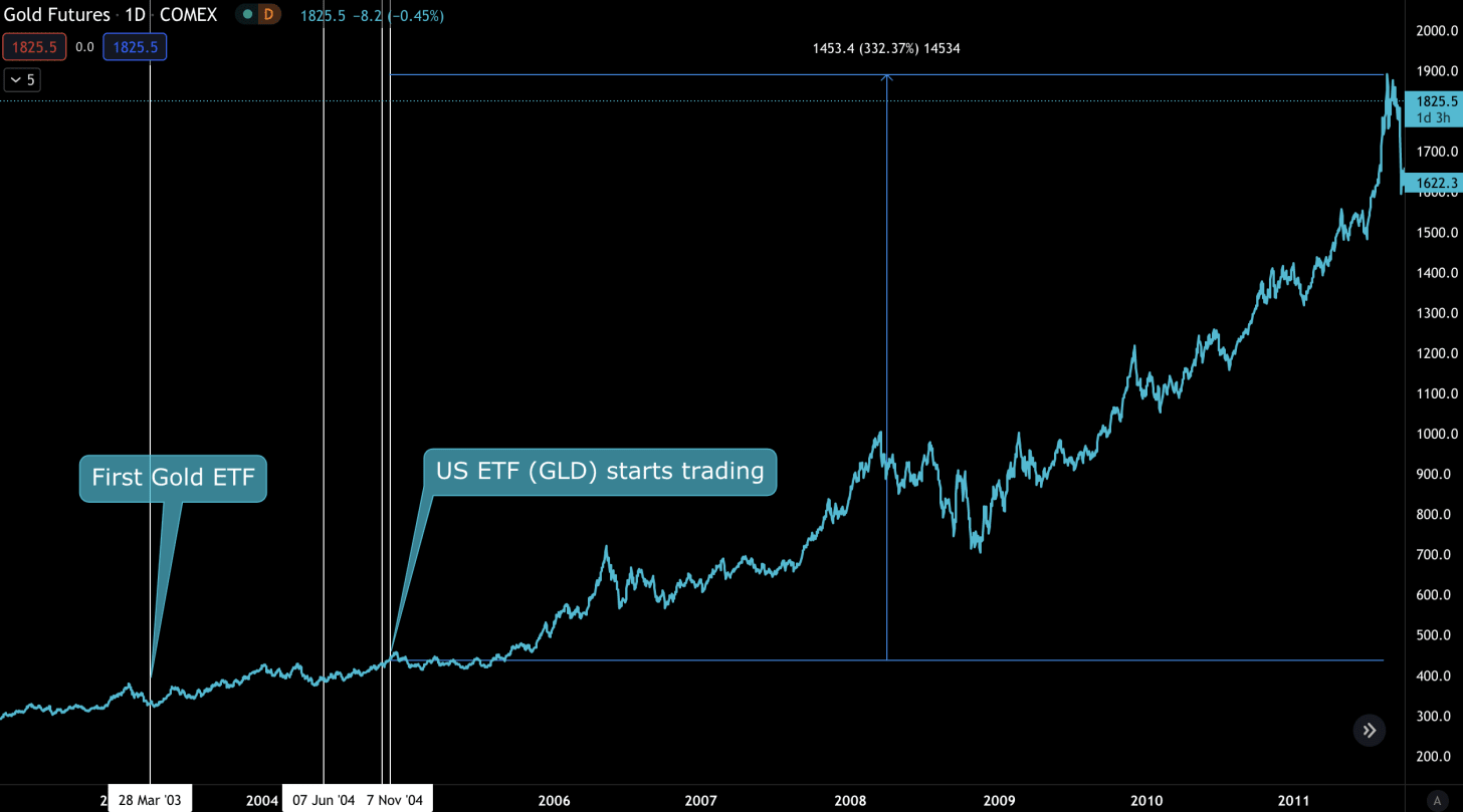2004년 11월 미국 금 선물 ETF가 승인된 이후 시장은 우상향을 시작햇고, 이후 5-6년 동안 Gold ETF는 포물선으로 상승하여 $420-$440에서 최고 $1900를 기록합니다.