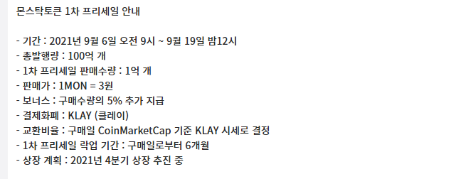 몬스탁 토큰은 2021년9월 프리세일 당시 개당 3원에 판매되었습니다. 총 발행량은 100억개이며 1차 프리세일 락업 기간은 구매일로부터 6개월입니다.