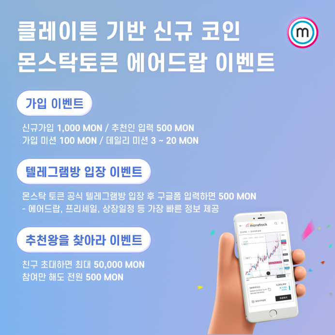 아하(AHA) 토큰이 업비트 상장해서 초기 출석 이벤트 참석자에게 꽤나 쏠쏠한 수익을 안겨주었듯, 몬스탁 토큰도 빗썸, 업비트 등 국내 거래소 상장을 기대해봅니다.