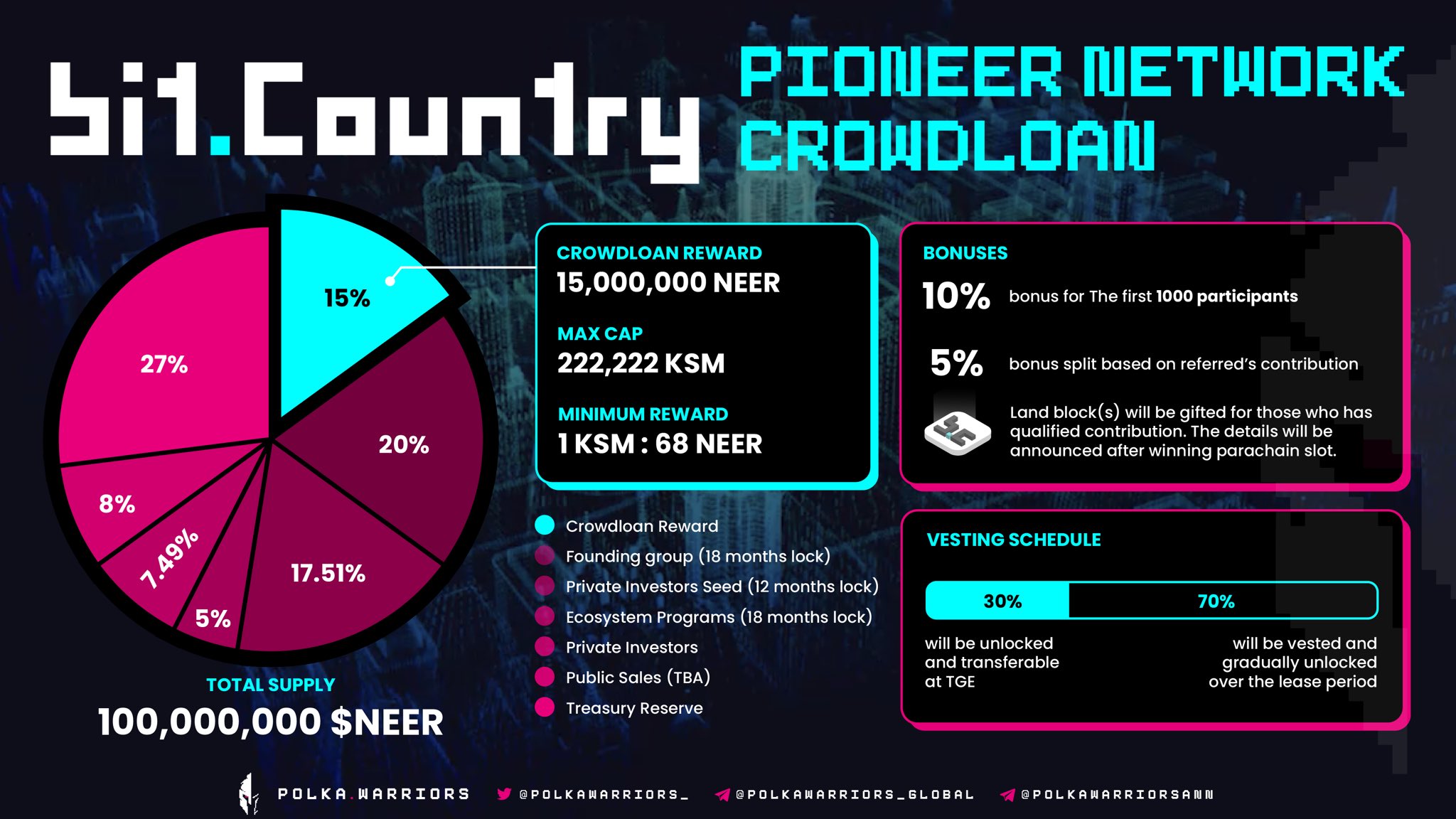 이번에 쿠사마 파라체인 옥션에서는 전체 1억 개 $NEER 토큰 발행량 중 15% 배분되었으며, 1KSM 당 할당량은 68 $NEER 입니다. 크라우드론 오픈 첫째날 1,000개의 지갑에 얼리버드 보너스(10% 추가)를 지급하기로 했는데, 수요가 몰리면서 조기 마감되었습니다.