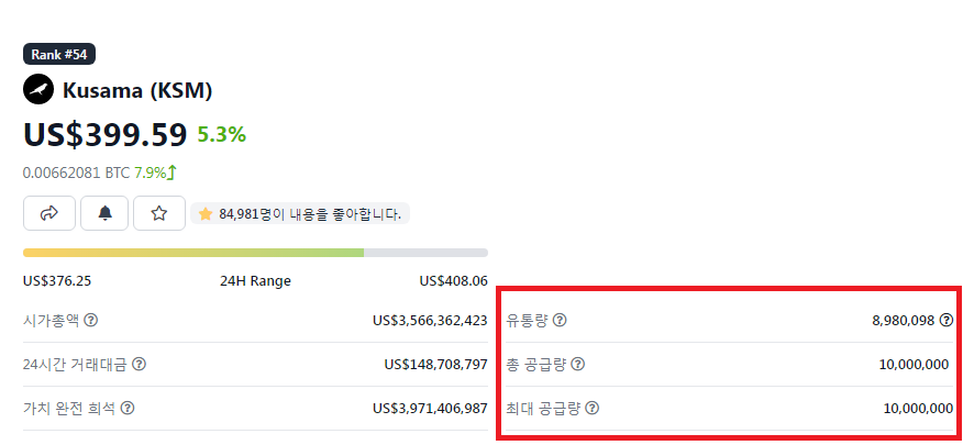 이게 KSM코인 가격 상승에 어떤 영향이 있냐구 물을 수 있습니다. 먼저 쿠사마 총 공급량을 살펴봅니다.