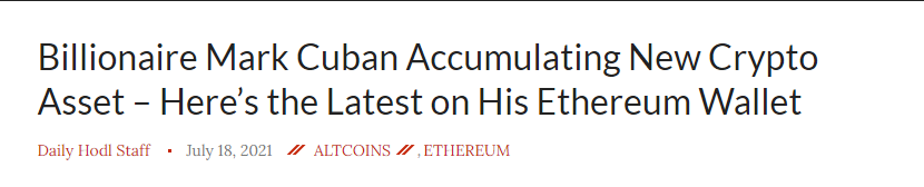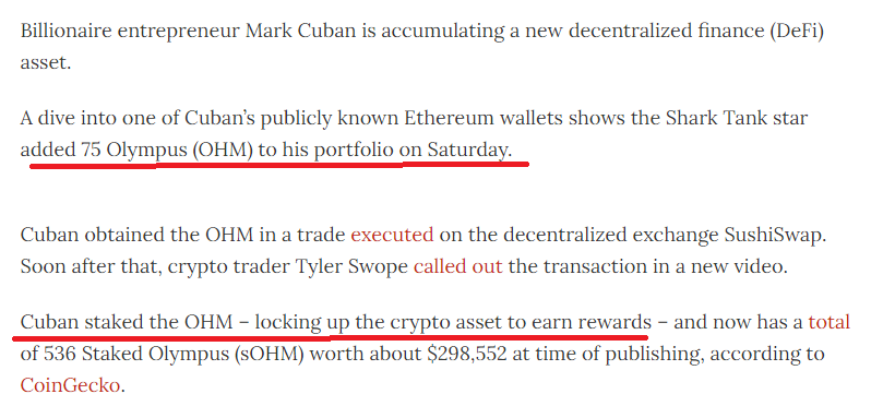 2021년7월18일 암호화폐 뉴스 데일리호들에 따르면 마크 큐반으로 추청되는 이더리움 지갑에서 OHM 토큰을 구매했으며, OlympusDao를 통해 스테이킹 중이라고 전했습니다.