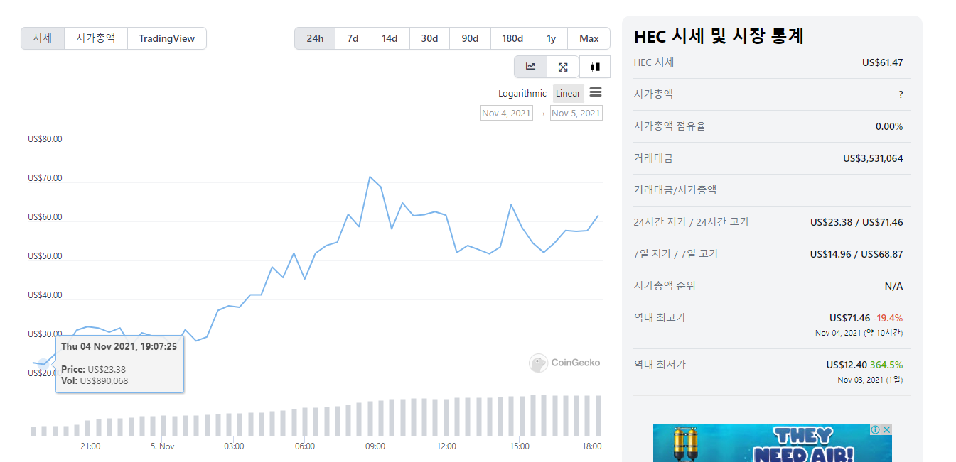 3) APY(연이율)도 10만% 이상이라는 말도 안되게 높은 이율을 주고있어, 4) 먹튀(RUGPULL)만 아니면 원금 회수가 문제없다고 판단했습니다. 이런 이유로 22$에 최초로 매수했고, 코인겟코 기준 71$를 찍고 조정중에 있습니다.