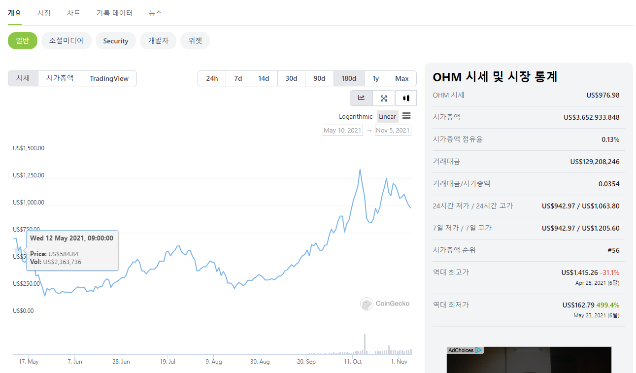 기본적으로 1 OHM = 1 DAI로 고정됩니다. 그런데 시간이 지남에 따라 1 OHM 토큰 가격이 상승합니다.