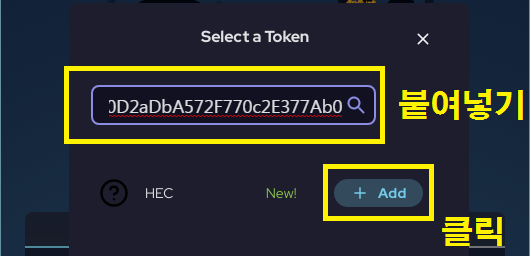 근데 여기서 또 문제가 생깁니다. dai를 선택하고 HEC 토큰을 검색해도 나오지 않습니다. 이 때는 코인겟코로 이동해서 HEC 토큰 컨트렉트 주소를 복사한 후 수동으로 스푸키스왑 토큰 선택 란에 붙여넣기 해줍니다.