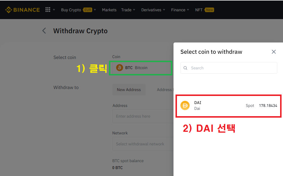 먼저 메타마스크 지갑을 연결합니다. 그리고 바이낸스에서 DAI를 구매합니다. 이제 DAI를 메타마스크 지갑으로 보내는 작업을 합니다.