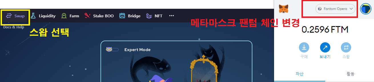전송이 완료되면 우측 상단에 트랜젝션이 생성됩니다. 이제 메타마스크 지갑 네트워크를 팬텀 오페라로 전환합니다. 그리고 스푸키스왑 페이지에서 swap으로 이동합니다.