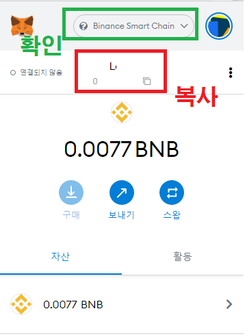 1) 먼저 메타마스크의 네트워크를 Binance smart chain으로 설정합니다. 그리고 자신의 지갑 주소를 복사합니다.