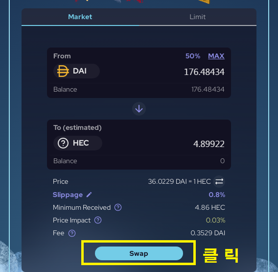그럼 이제 토큰 스왑을 위한 준비가 되었습니다. 이제 SWAP 버튼을 클릭해서 스왑해줍니다.