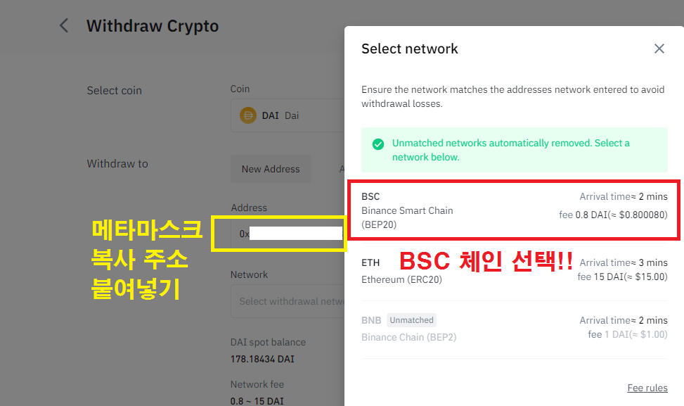 2) Network를 선택할 때 반드시 BSC(BEP20) 바이낸스 스마트 체인을 선택합니다.