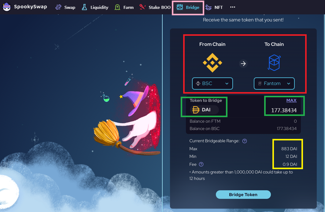 현재 스푸키스왑 브릿지 페이지에서 메타마스크 지갑 네트워크는 BSC 상태이고, Token to Bridge 를 dai로 선택한 후, 보낼 수량을 입력해 줍니다. 이 때, 주의해야할 점은 브릿지 range에서 미니멈과 맥스 사이 수량을 맞춰서 보내줍니다.