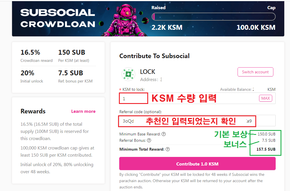 그리고 추천인과 추천받은 사람 모두 1KSM 당 7.5 SUB토큰을 추가로 배분하기 때문에 서브소셜 옥션 참가를 원하시는 분은 아래 추천인 링크를 이용해주시면 서로 이득입니다.