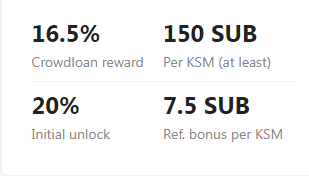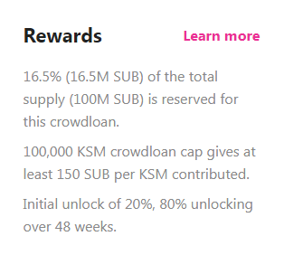 이번 쿠사마 크라우드론 보상 비율은 전체 SUB 토큰 발행량 대비 16.5%를 할당 받았으며, 1KSM 당 150SUB 토큰을 최소로 할당 받습니다.