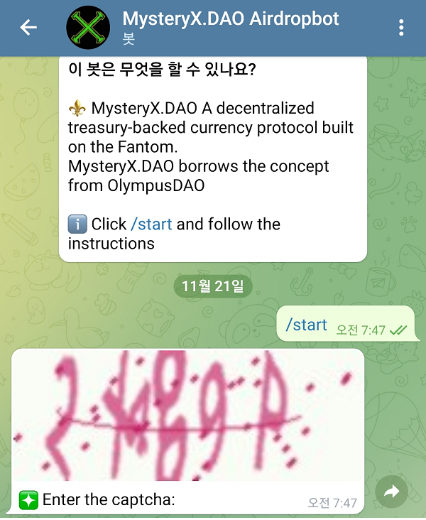 먼저 미스터리X 텔레그램 봇에 아래 추천 링크로 접속합니다. 그럼 아래와 같이 텔레그램이 뜹니다.