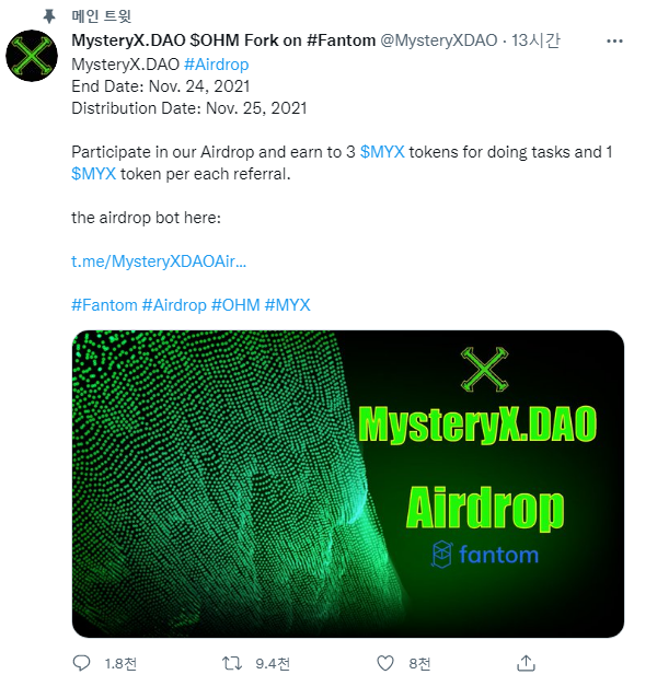 미스터리X 다오 에어드랍 이벤트에 1일 만에 벌써 8천명 이상 참여했습니다. 반응이 뜨겁습니다.