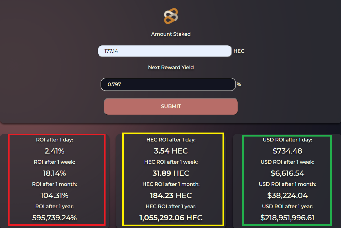 하루에 3번의 REBASE(8시간에 1번, 1일 3번)를 통해서 3.54 HEC을 받을 수 있습니다. 그리고 복리 이자를 받게 될 경우 1년 후 1,055,292 HEC 코인을 보유하게 됩니다. ^^;