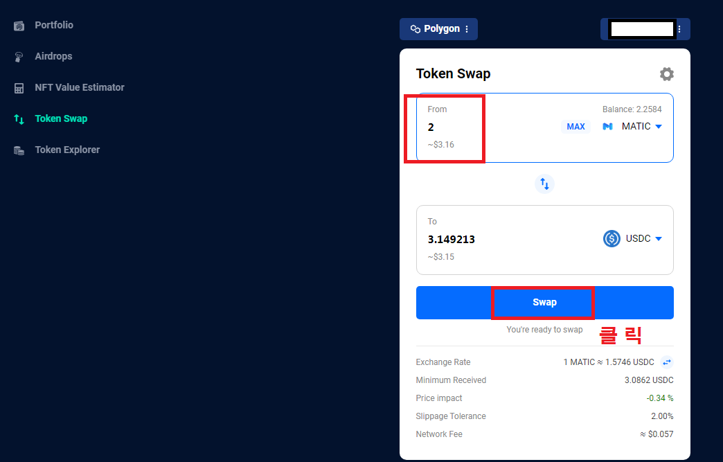 스왑 방법은 매우 간단합니다. 먼저 DappRadar 링크로 접속합니다. https://dappradar.com/hub/swap/polygon