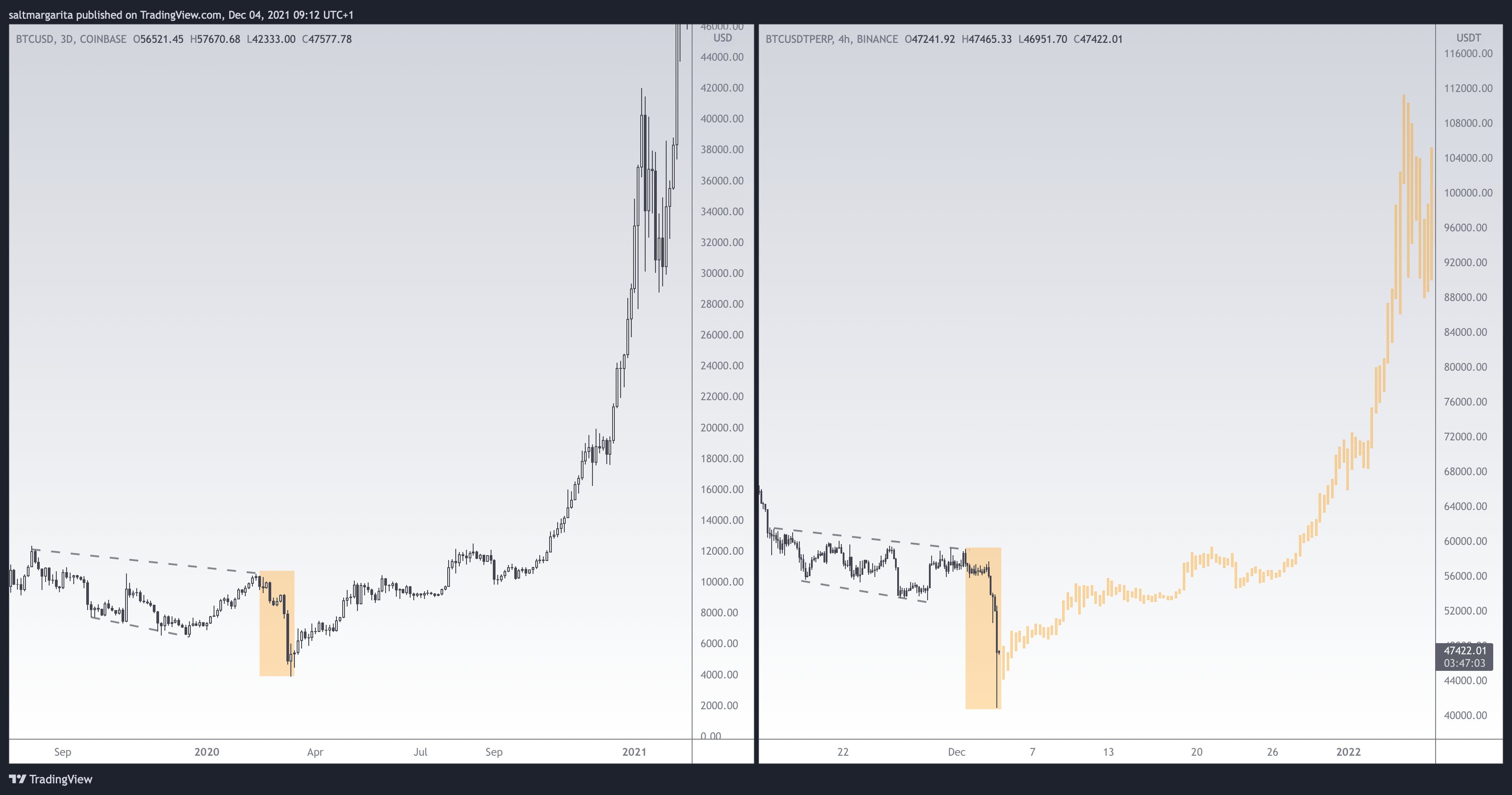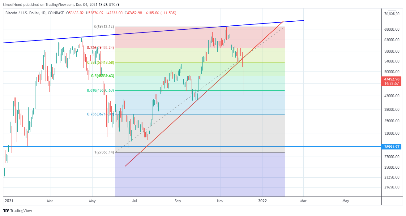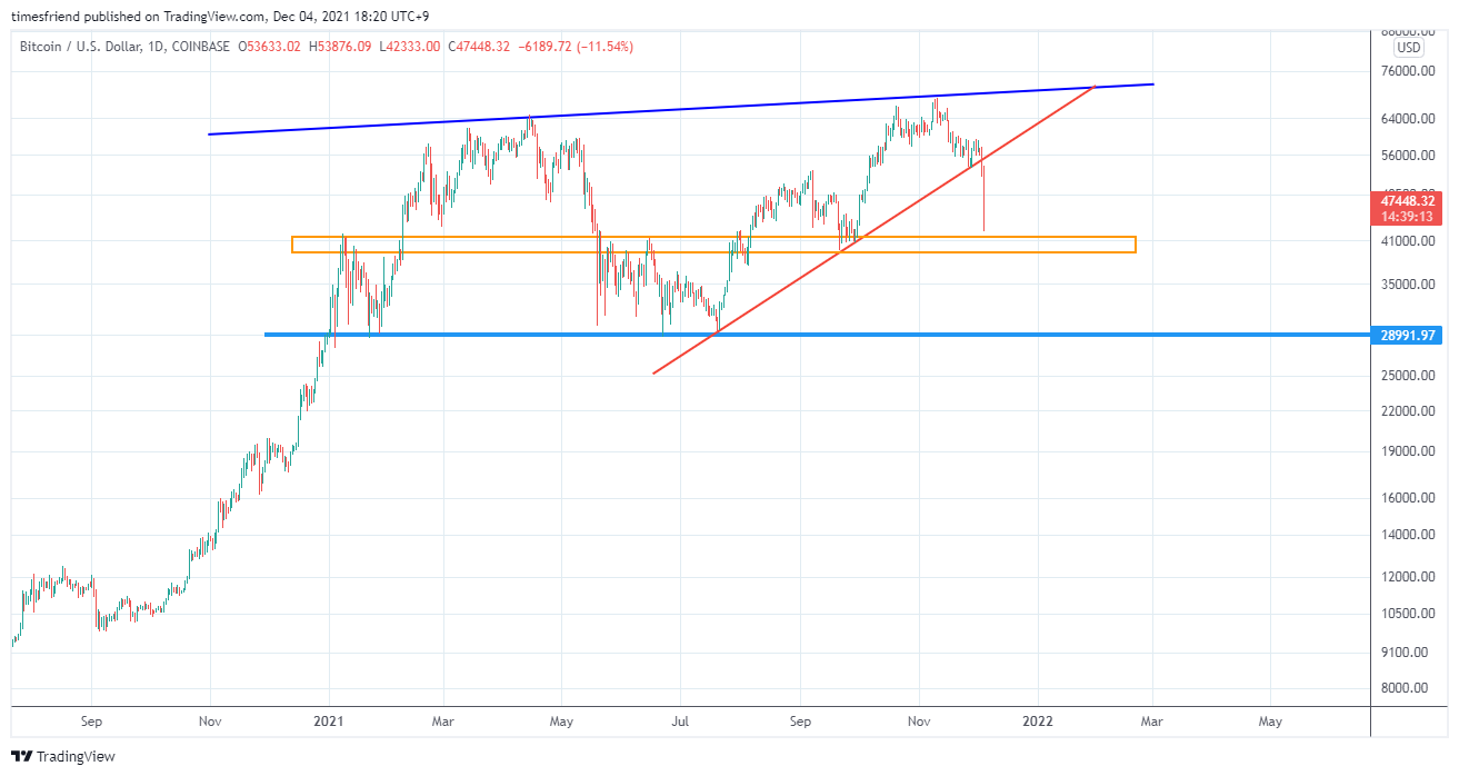 그러면서 42k까지 가격이 급격히 하락한 후, 현재 47k까지 밑꼬리를 만들고 반등한 상황입니다.