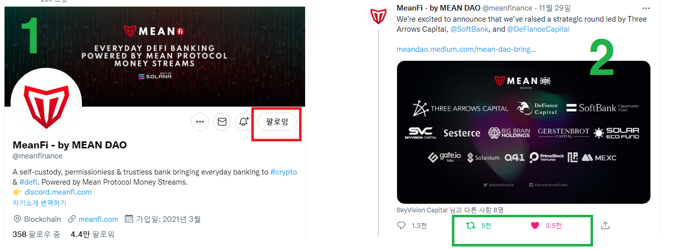 3) MEANfi 트위터 팔로우, 리트윗하기
