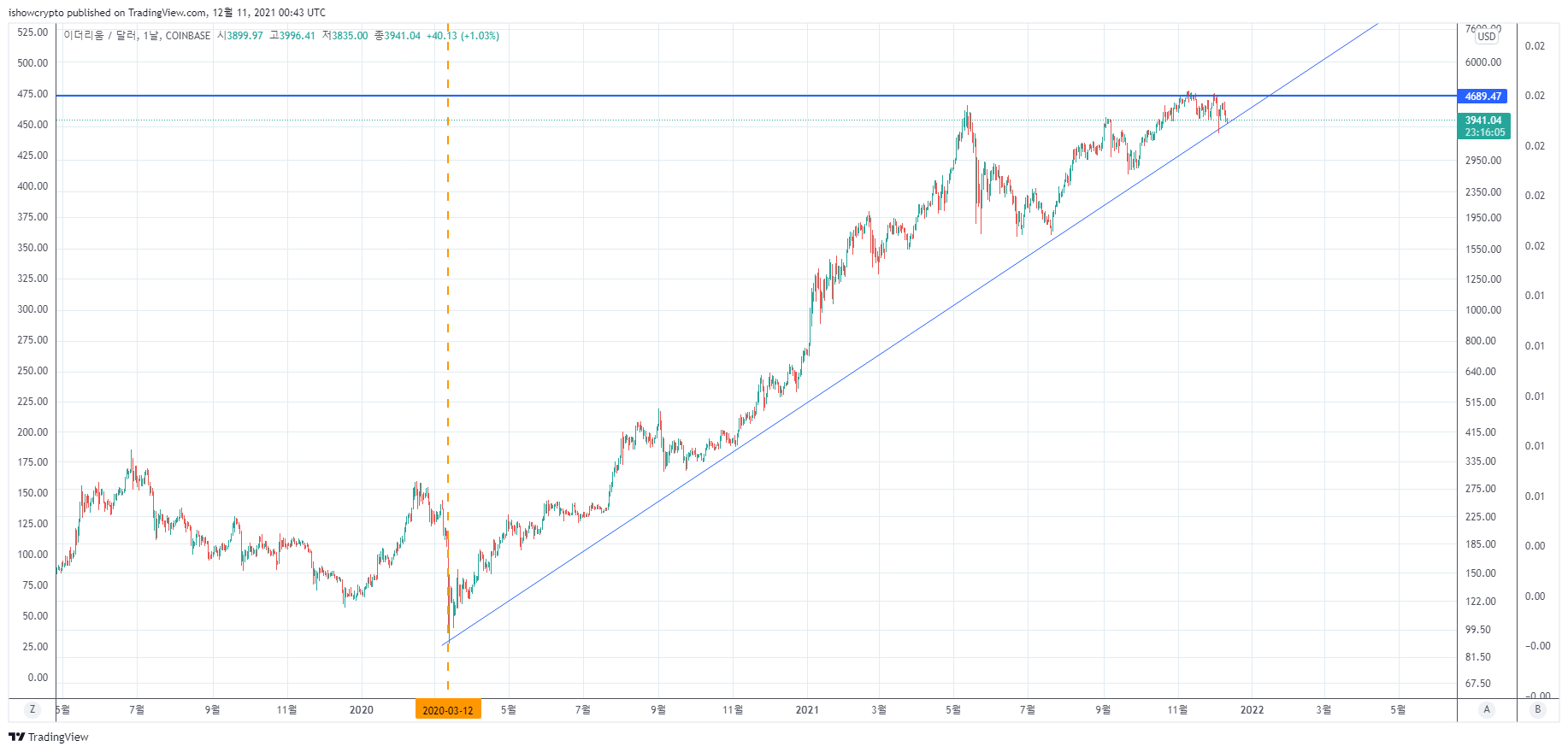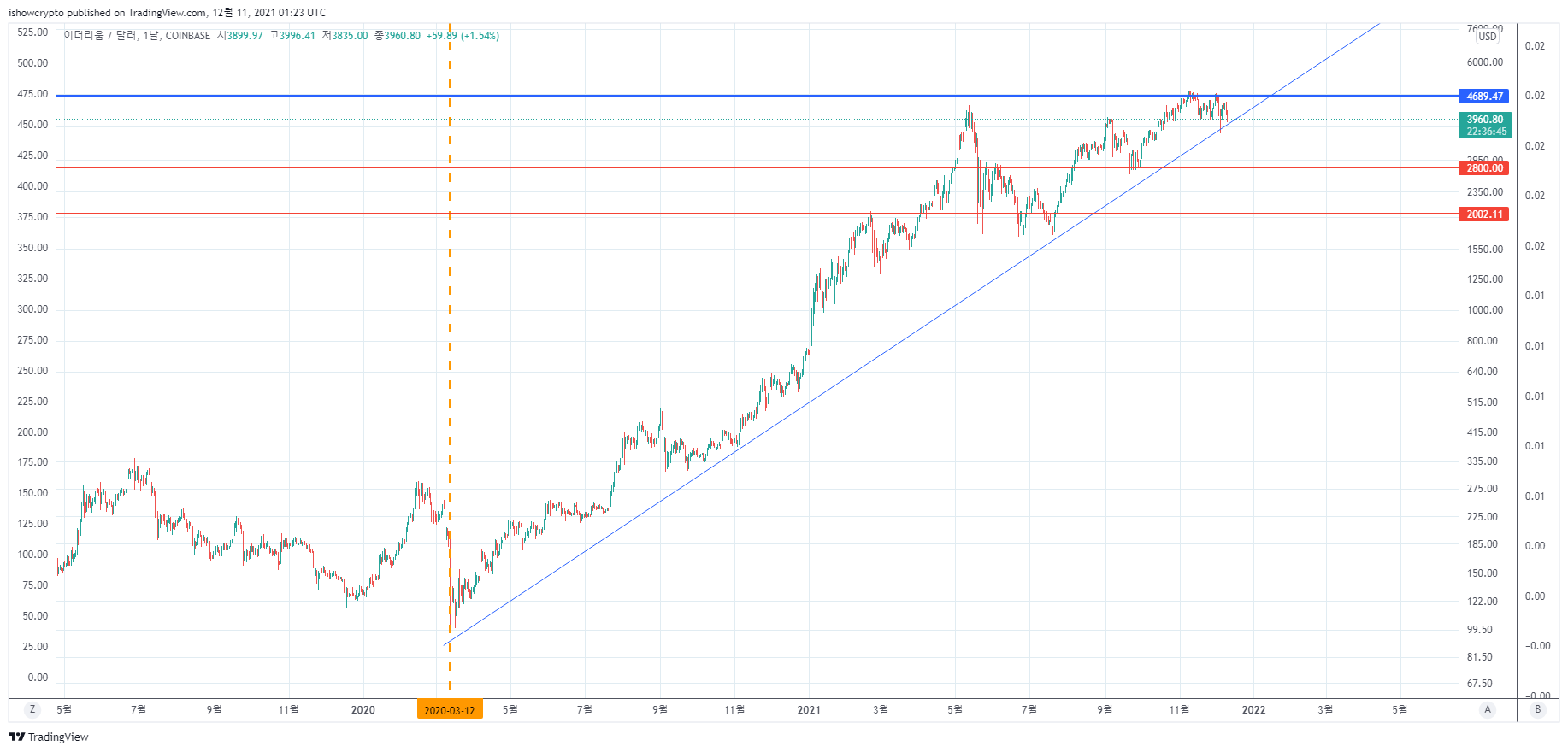 만약 이 구간에서 지지를 받고 신고가(4,800달러)를 갱신한다면 2022년1분기 이더리움 시세 1만달러 전망이 터무니없는 가격이 아닐 것입니다.