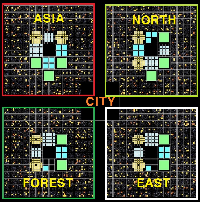 각 구역은 중심부 도시(CITY)를 중심으로 4개의 구역으로 구분됩니다.