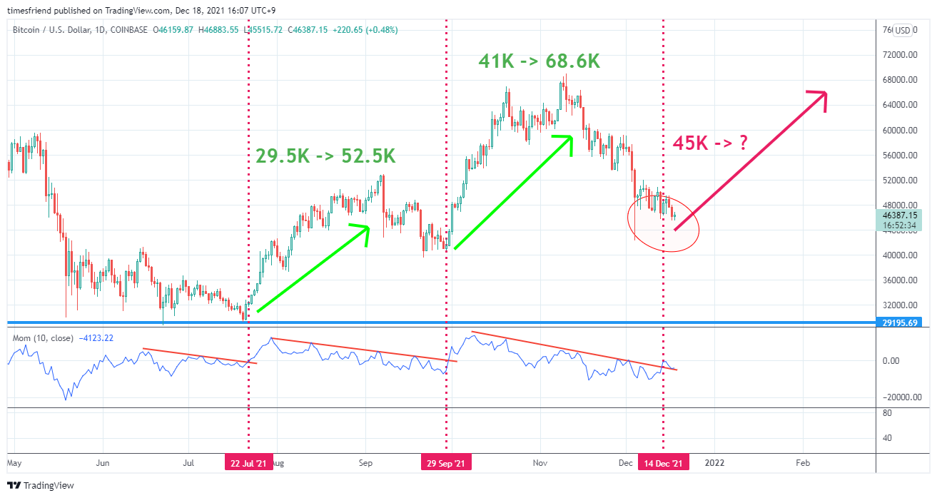 그리고 몇달 간 지속된 하락 끝에 다시 한번 모멘텀 지표 돌파가 나타난 가격이 46.3K 입니다.