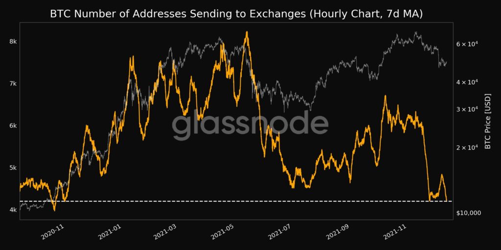 온체인 분석 업체 글라스노드에 따르면 현재 거래소로 입금되는 BTC 주소 수가 최저치를 기록하고 있습니다.