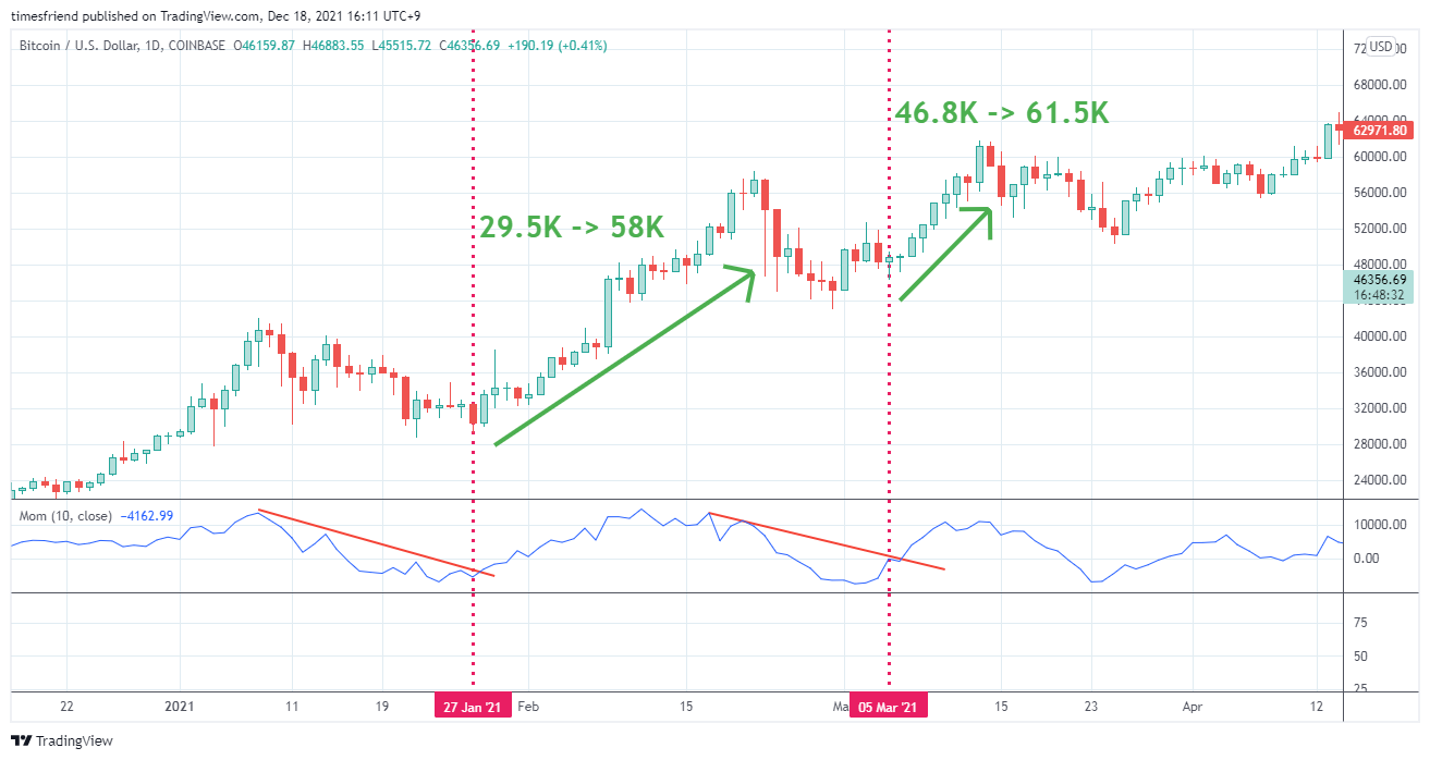올 초 1월에 모멘텀 지표의 돌파가 일어난 후 비트코인은 29.5K -> 58K까지 약 2배 상승했습니다.