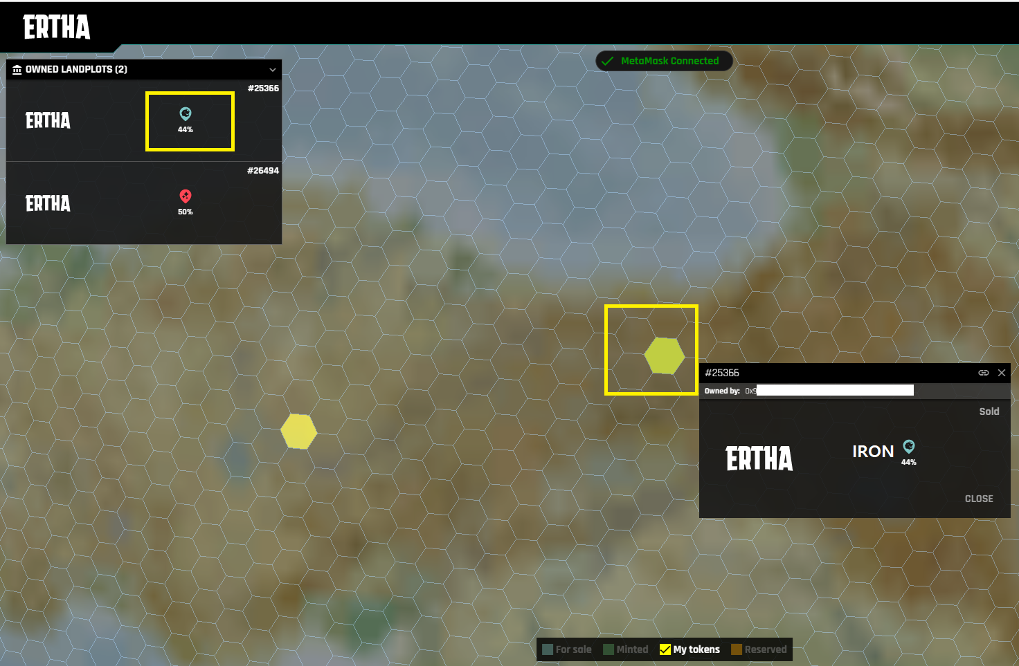 토지 중 하나는 아이언을 채굴할 수 있는 지역을 샀습니다. 이 땅의 가격은 $288(한화 35만원)입니다. 44%는 무엇을 의미하는지 아직은 알 수 없지만 추측컨데 자원 채굴을 성공할 확률이 아닐까 생각합니다.