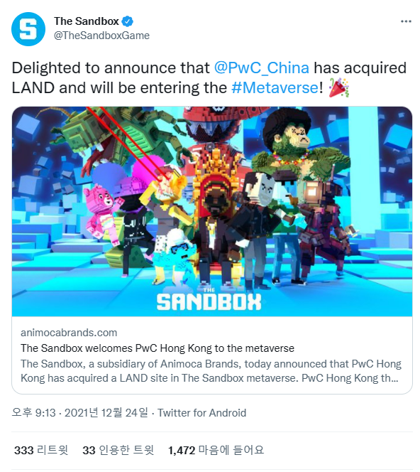 이런 대형 회계법인이 메타버스 플랫폼 샌드박스(SANDBOX)에 토지를 구매했다고 합니다. LAND 구입 비용은 공개되지 않았습니다.