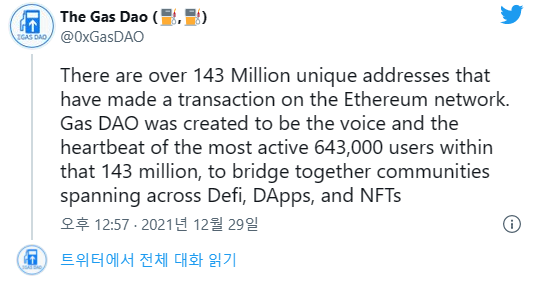 가스다오 트위터에 따르면 이더리움 네트워크에는 총 1억43백만개 주소가 있으며, 가스다오는 이들의 목소리에 귀를 기울어 만들어진 탈중앙화분산조직(DAO) 임을 언급합니다.