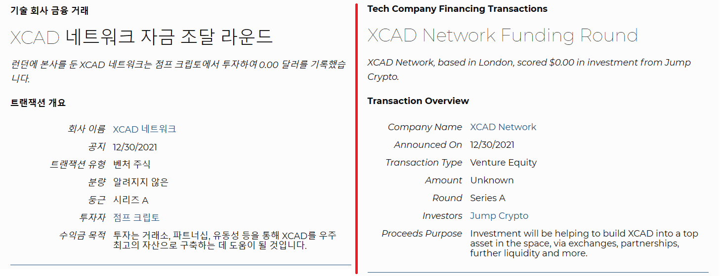 가장 최근인 2021년12월 VC 투자 현황을 살펴보면 날짜별로 어떤 프로젝트 펀딩을 받았는 지 알 수 있습니다. 12월30일 XCAD 프로젝트를 클릭해보겠습니다.