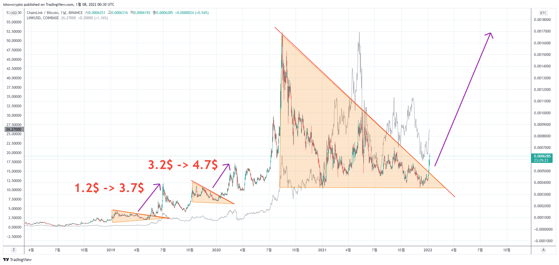 그렇다면 이번 상승이 이전보다 훨씬 큰 폭의 상승을 그릴 가능성이 크며, 이제 막 삼각수렴을 돌파한 LINK코인 가격은 폭발적인 상승을 시작했을지도 모릅니다.