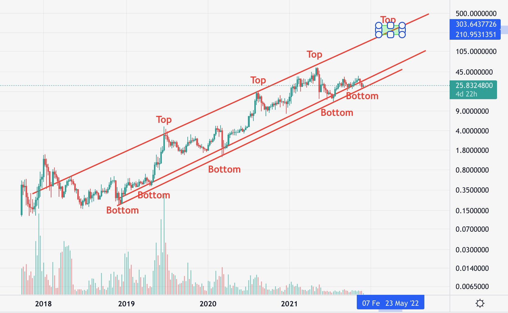 트위터 분석가 @cryptocycle에 따르면 LINK코인 가격은 추세선의 하단에 맞닿아 있으면서 시세 폭발을 앞두고 있다고 분석했습니다. 그에 따르면 이번 상승 사이클의 고점은 추세선을 바탕으로 TOP 부근인 300$ 를 예상합니다.