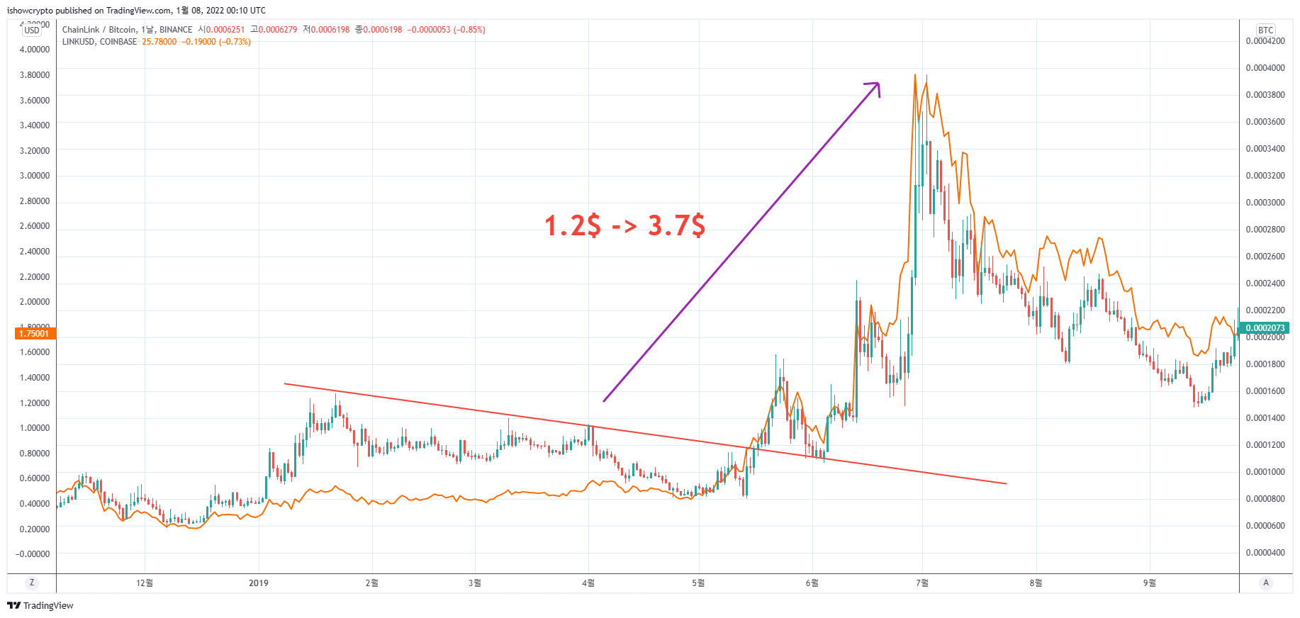 2019년6월에 저항선을 돌파한 체인링크는 단 2달만에 가격이 3배 상승한 3.7$에 도달합니다.