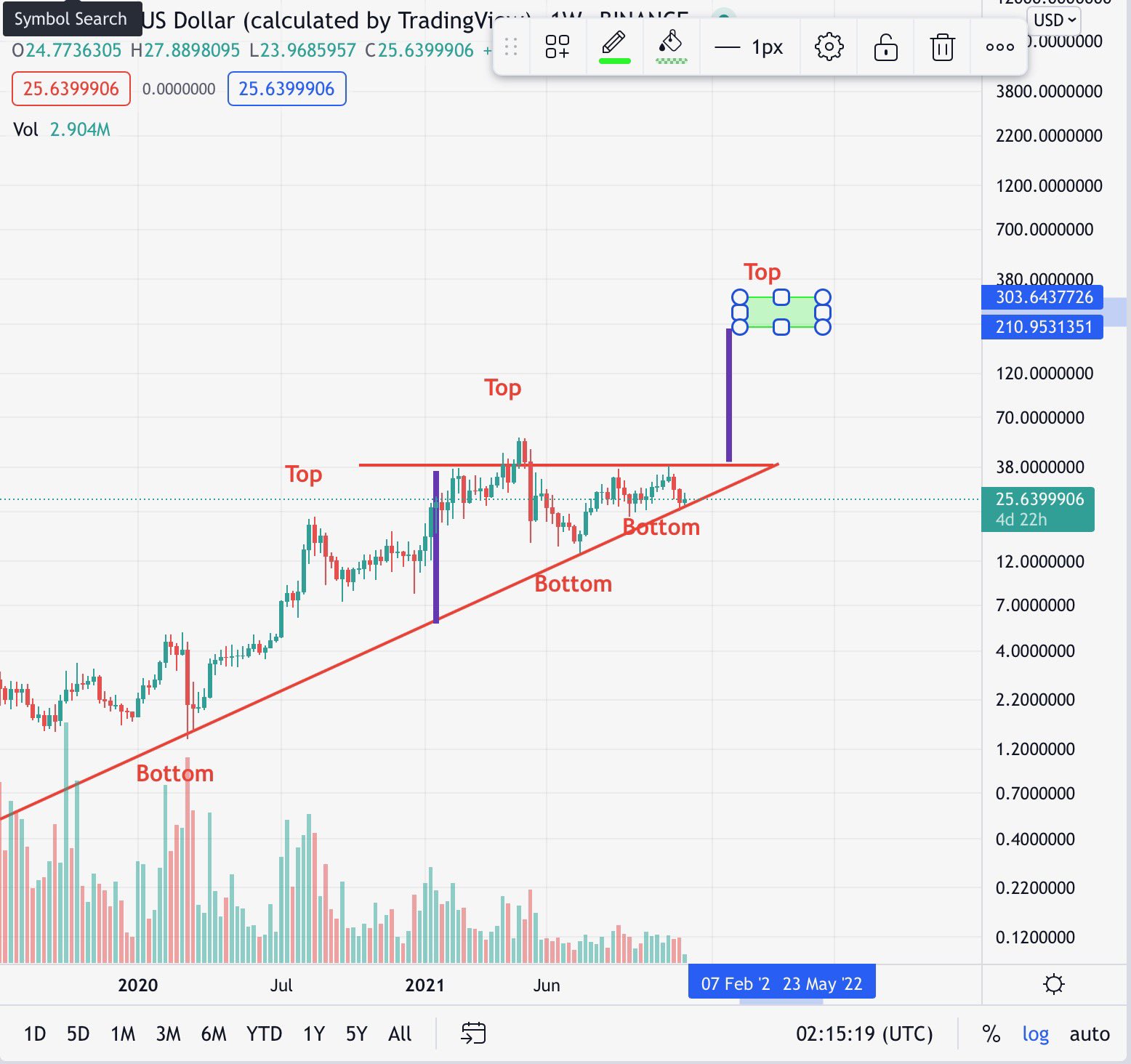 트위터 분석가 @cryptocycle에 따르면 LINK코인 가격은 추세선의 하단에 맞닿아 있으면서 시세 폭발을 앞두고 있다고 분석했습니다. 그에 따르면 이번 상승 사이클의 고점은 추세선을 바탕으로 TOP 부근인 300$ 를 예상합니다.