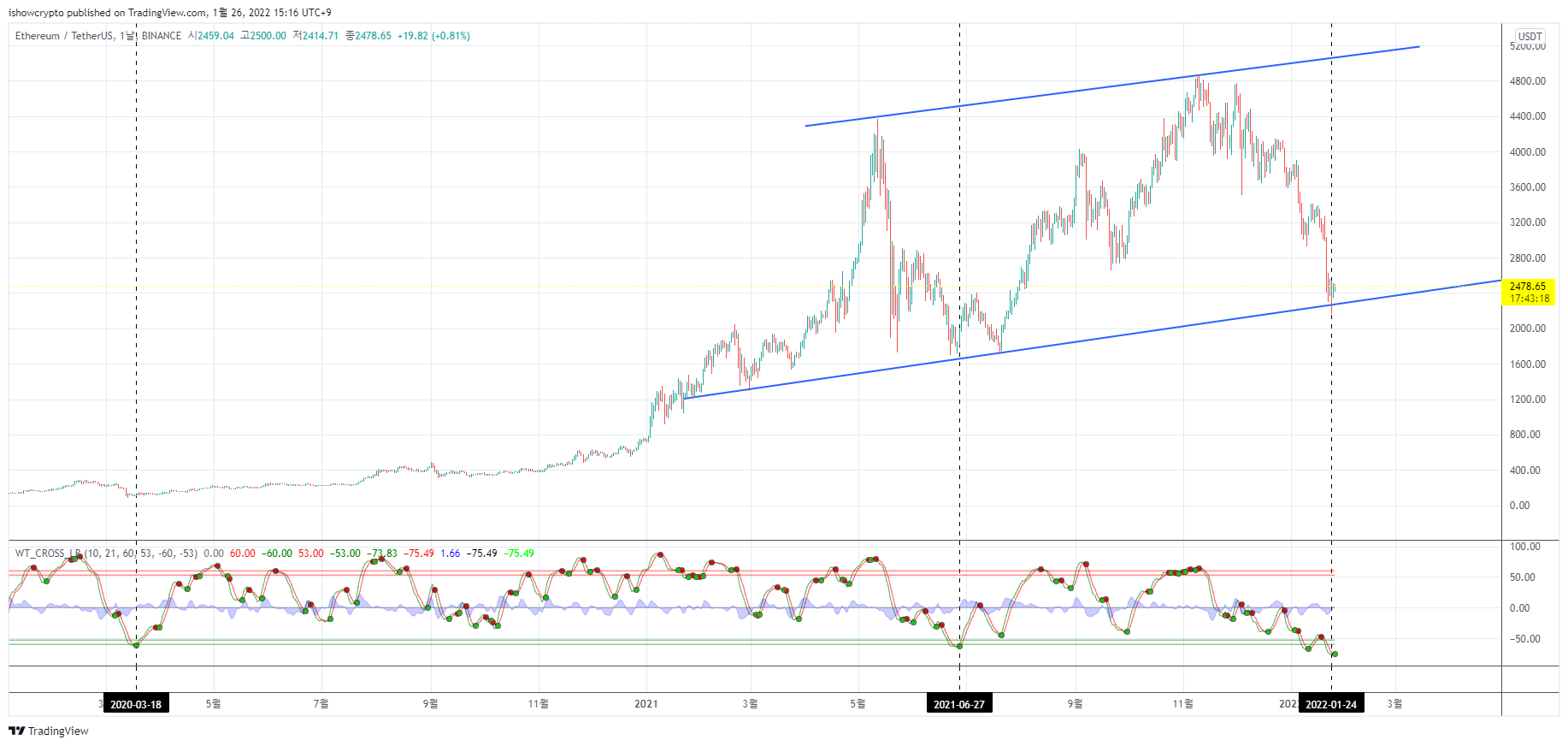 현재 이더리움은 시장 패닉으로 인한 과매도 구간에 진입하여 매수를 하기에 매우 좋은 타이밍임을 알 수 있습니다. 단기적으로 다시 한번 지지선 테스트를 위해 하락 할 수도 있겠지만 이는 일시적이라고 생각되며, 현 시점에서 분할로 매수하면 2022년에 최소한 이 가격대보다는 위에 있을 것이라 판단합니다.