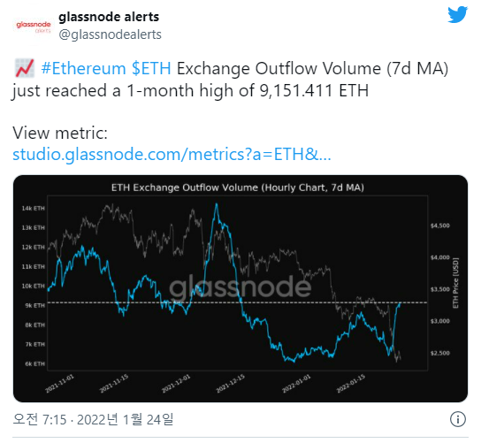 이더리움 온체인 데이터 글래스노드에 따르면 이더리움의 거래소 밖 출금량이 9,151개로 한 달만에 최고치를 기록했다고 합니다.