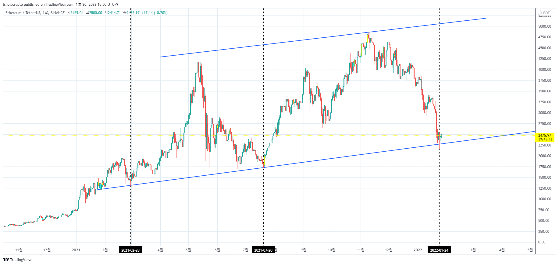 이더리움 일봉 차트를 살펴보면 아직까지 상승 추세가 깨지지 않았음을 알 수 있습니다. 2021년1월부터 이어져 온 상승 추세의 지지라인을 이번 폭락에서 잘 버텨줬으며, 일봉상 밑꼬리도 길게 뽑으면서 하락에서 상승 전환 패턴에서 자주 출현하는 망치형 캔들을 형성했습니다.