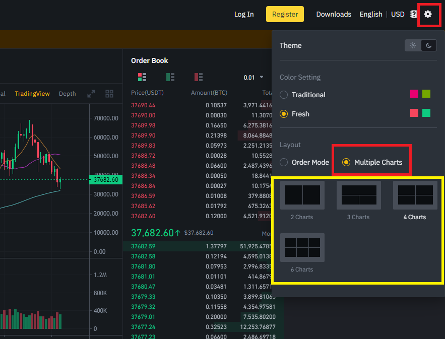 우측 상단에 설정 아이콘 -> Multiple Charts -> 4Charts 클릭합니다.