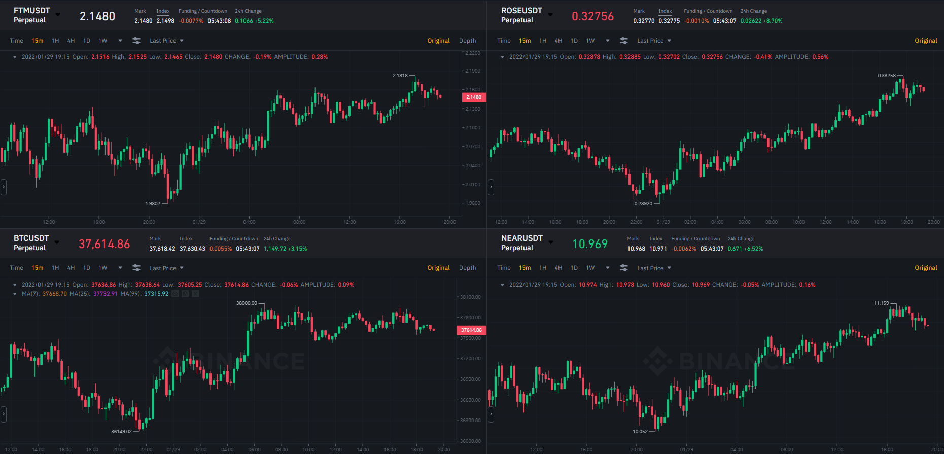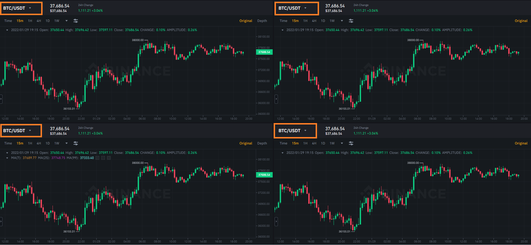 그럼 4개의 멀티플 차트가 설정되었습니다. 이제 본인이 자주 거래하는 코인을 BTC/USDT를 클릭해서 설정해줍니다. 이런식으로 설정을 다하고 주소창에 링크를 즐겨찾기 해두면 다음 번에 별도로 차트 설정을 할 필요없이 바로 볼 수 있습니다.