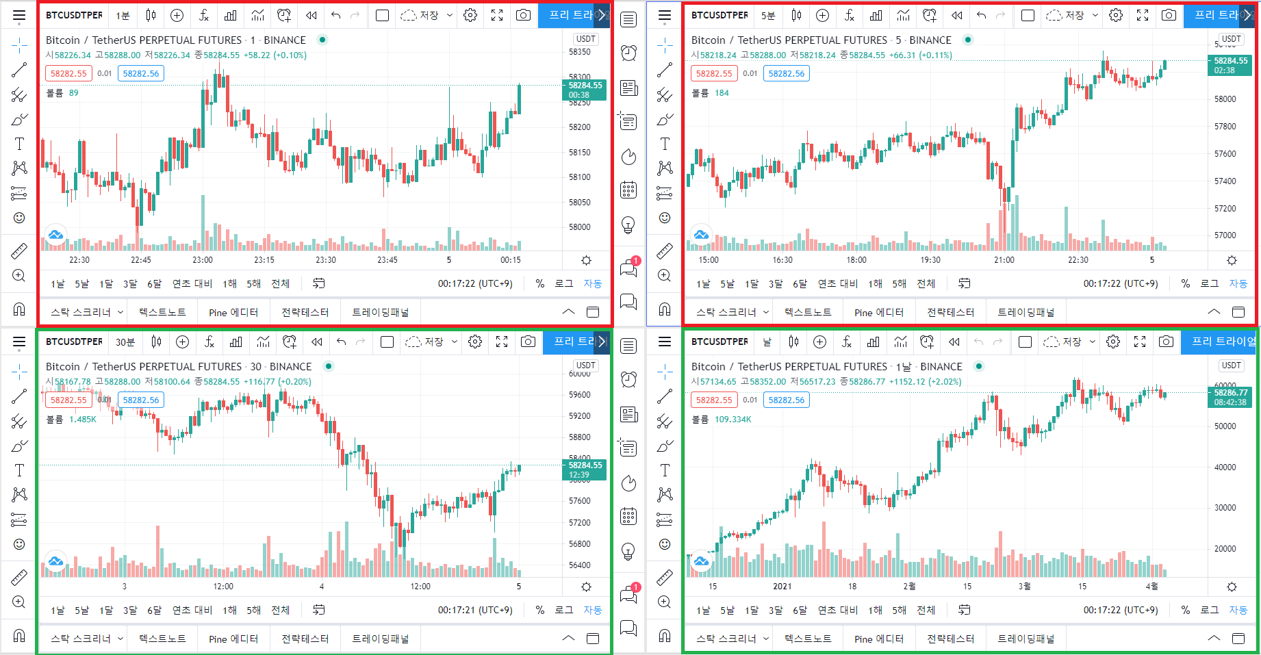 하지만 안타깝게도 위 멀티차트를 이용하기 위해서는 트레이딩뷰 유료결제가 필요합니다. 그렇다면 다른 방법은 없는 것인가? 가능합니다. 바로 바이낸스 거래소의 멀티차트를 이용하는 방법입니다.